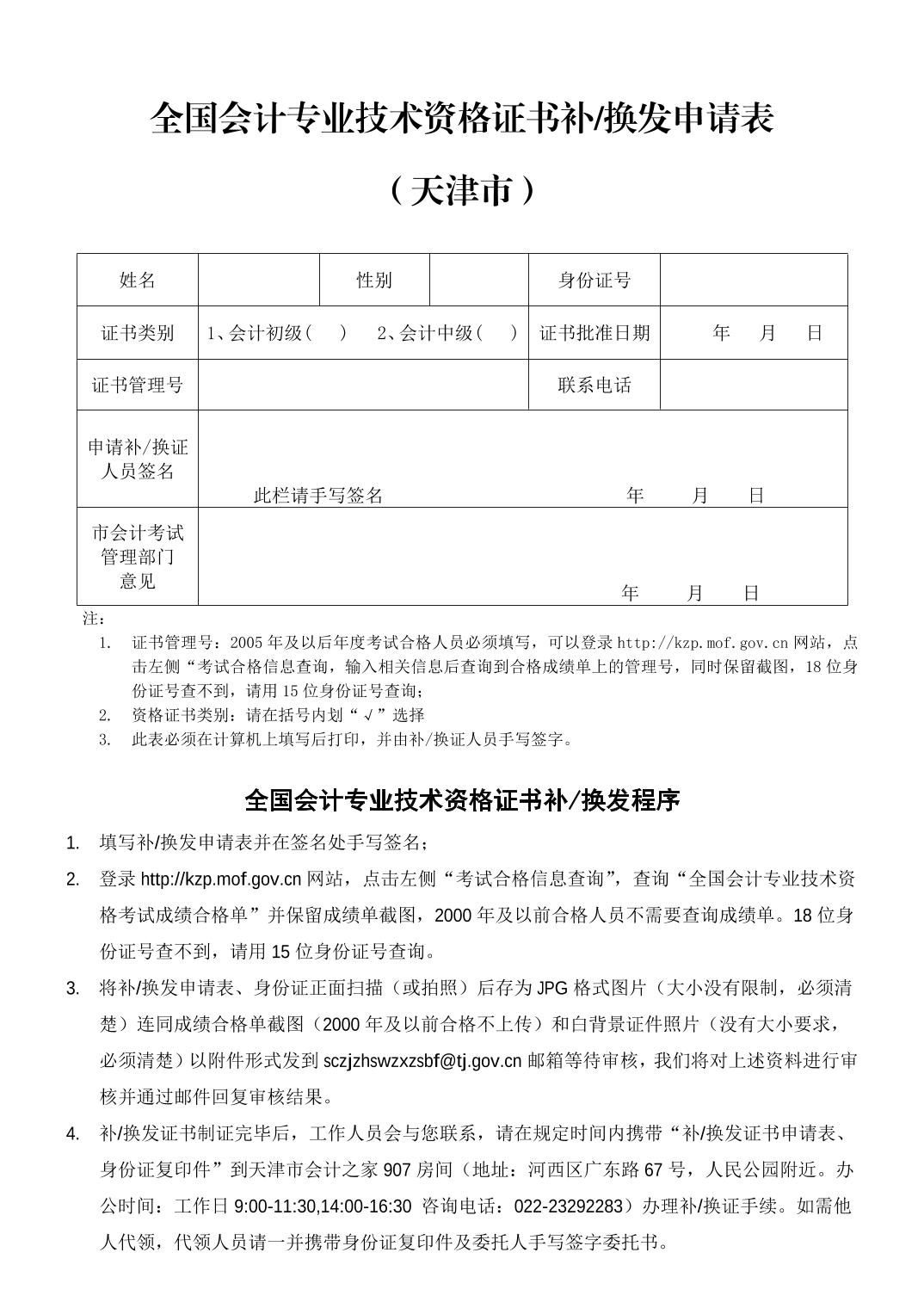 全国会计专业技术资格证书补/换发申请表(天津市)