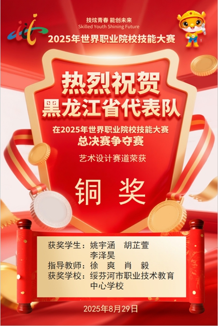 近日,2025年世界职业院校技能大赛全国总决赛艺术设计赛道(中职组)在贵阳落幕。绥芬河市职教中心工艺美术专业学生李泽昊、姚宇涵、胡芷萱三人从全国34个省市114支代表队中脱颖而出,喜获铜奖,刷新学校赛事获奖历史。