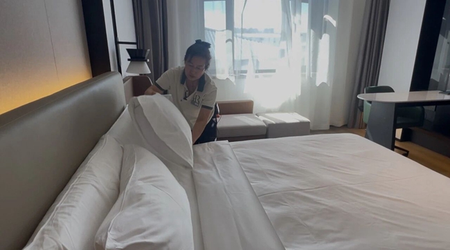 为让客人住得安心舒心,海润国际酒店的清洁团队对每一间客房展开了全方位的清洁工作。床品经严格清洗消毒,以崭新洁净之姿迎接客人。卫生间洁具光洁如新,洗漱用品摆放整齐。工作人员对酒店内的消火栓进行了细致的检查,确保紧急时能迅速投入使用,为客人生命安全护航。